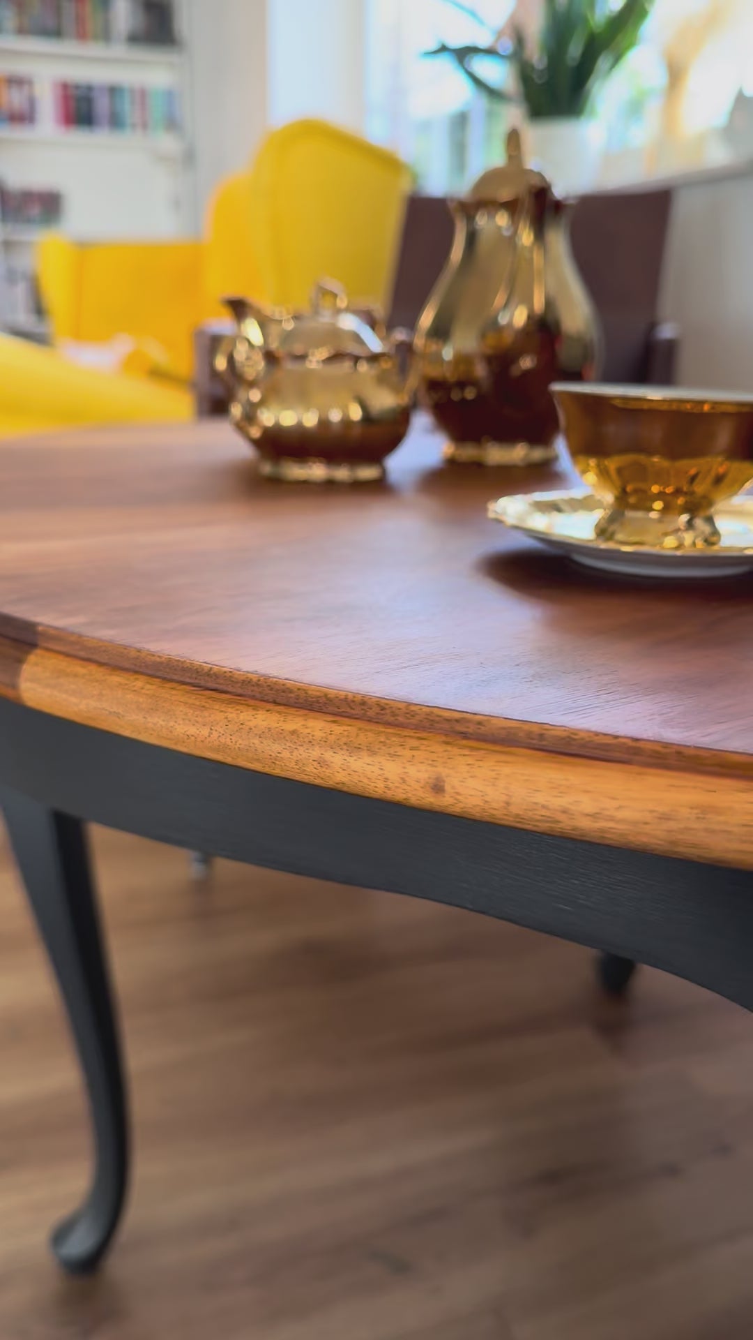 Die Tischplatte wurde sorgfältig abgeschliffen, gereinigt und eingefettet, um die natürliche Maserung des Echtholz-Furniers wieder zum Leben zu erwecken. Das Untergestell ist in einem seidenmatten Schwarz mit Kreidefarbe lackiert – für einen stilvollen, zeitlosen Look, der sich mühelos in verschiedene Einrichtungsstile einfügt.